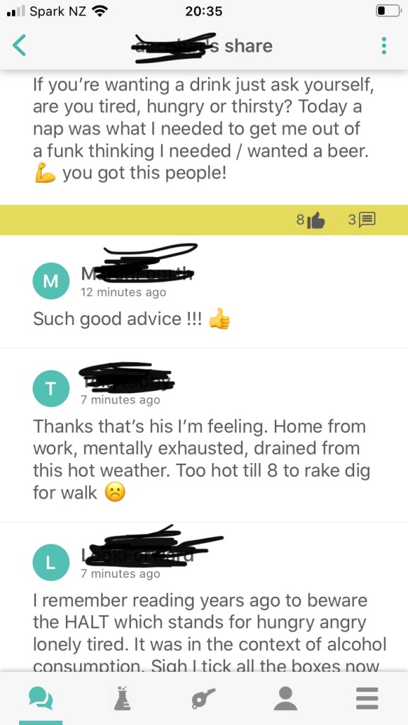 Progress on the sobriety: I’ve downloaded an app called Daybreaker where people trying to stay alcohol free or moderate alcohol (Jo, Day 4 AF – oh yes, there’s all the slang to learn too) share their triumphs and fuck-ups and their temptations, and others give them suggestions and encouragement. For example: Am I Hungry Angry Lonely or Tired?